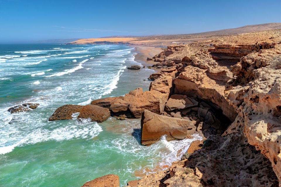 En route, admirez la diversité des paysages côtiers et arrêtez-vous brièvement à Tiznit, célèbre pour ses remparts historiques et son artisanat d’argent.