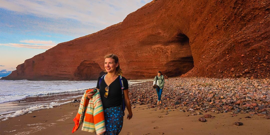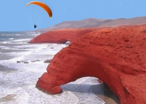 Partez pour une journée exceptionnelle à la découverte de la célèbre plage de Legzira, nichée entre Mirleft et Sidi Ifni. Réputée pour ses spectaculaires arches de roche rouge sculptées par le temps, Legzira est un véritable chef-d’œuvre de la nature. Entre falaises ocre, sable doré et vagues de l’Atlantique, ce site unique offre un décor aussi majestueux que photogénique.